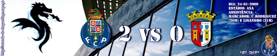 Notas de Jogo: Hoje começo pelas notas negativas, a arbitragem não foi péssima mas também teve longe do bom, errou, tanto para o F.C.Porto como para o Braga, nem vou dizer os lances, pois todos ou praticamente todos vão tirar as mesmas conclusões, a outra vai para a comunicação social principalmente para os comentadores, eu nunca me referi a eles mas já passou os limites, criticam demasiado o F.C.Porto, dizem coisas erradas de lances e tiram as suas próprias conclusões mesmo que as imagens os contradizem, é de facto vergonhoso, passando as notas positivas, a primeira é para o jovem Cissokho, penso que o Braga no inicio jogou sempre para Cissokho propositadamente, mas Cissokho até não esteve mal, algo nervoso, depois com o decorrer do jogo melhorou muito e até fez um grande lance, talvez o lance da noite ( sem contar com a defesa de Helton ), que poderia ter dado o 3 golo para o F.C.Porto, penso que apesar de cedo posso afirmar que temos um defesa esquerdo definitivo, a segunda nota positiva vai para Hulk, as vezes irrita por não passar, mas também se não fosse ele o F.C.Porto praticamente não ia ao ataque, a outra positiva vai para Lisandro que apesar de falhar aquele golo de caras, fez um jogo bom e marcou um golo e para terminar o nosso Obama ( Fernando ), começou um pouco nervoso mas acabou muito bem o jogo gostei de ver Fernando.