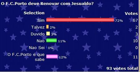 Perante isto tudo a opinião de 93 pessoas foi evidente, com um avanço de 56 votos a resposta, SIM, O F.C.Porto deve renovar com Jesualdo foi a vencedora, claramente os Portistas querem ver Jesualdo mais um ano no banco dos nossos Campeões e quem sabe fazer melhor que Mourinho, depois houve um equilíbrio da resposta Não e da resposta O F.C.Porto é que sabe, onde vence por apenas um voto (11) "O F.C.Porto é que sabe, realmente o F.C.Porto é o último a ter a palavra sobre este assunto e espero que já no domingo no final do F.C.Porto - Nacional, se assine o contrato da renovação.