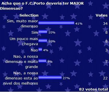 Será mesmo que o F.C.Porto deveria ter maior dimensão, para começar para os 82 votantes houve muita diferença em opiniões, com votos muito dispersos mas onde os dois extremos da pergunta quase se igualam no número de votantes, para 34 dos 82 votantes o F.C.Porto claramente deveria ter maior dimensão e para outros 22 o F.C.Porto tem uma dimensão ao nível dos melhores, depois as restantes respostas foram divididas.