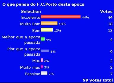 Estamos quase quase no inicio de começar-se a jogar a sério, já no dia 8 temos a SuperTaça frente ao Paços de Ferreira e que devemos vencer, portanto vou fazer análise a uma importante pergunta que muitas vezes nós portistas nos colocamos, como é que podemos classificar esta equipa do F.C.Porto?!, segundo os 99 votantes, 44 deles dizem que a equipa está excelente, e 42 deles dividiram-se pela positiva, achando que está bem ou melhor que a época passada, pela negativa ficaram-se apenas 20 votantes.